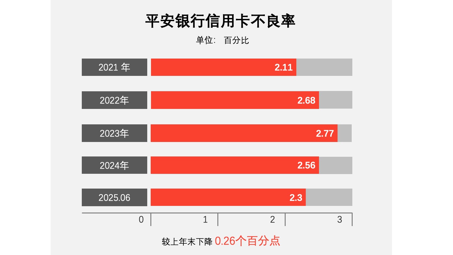 截至报告期末,平安银行信用卡不良率2.3%,较上年末下降0.26个百分点。
