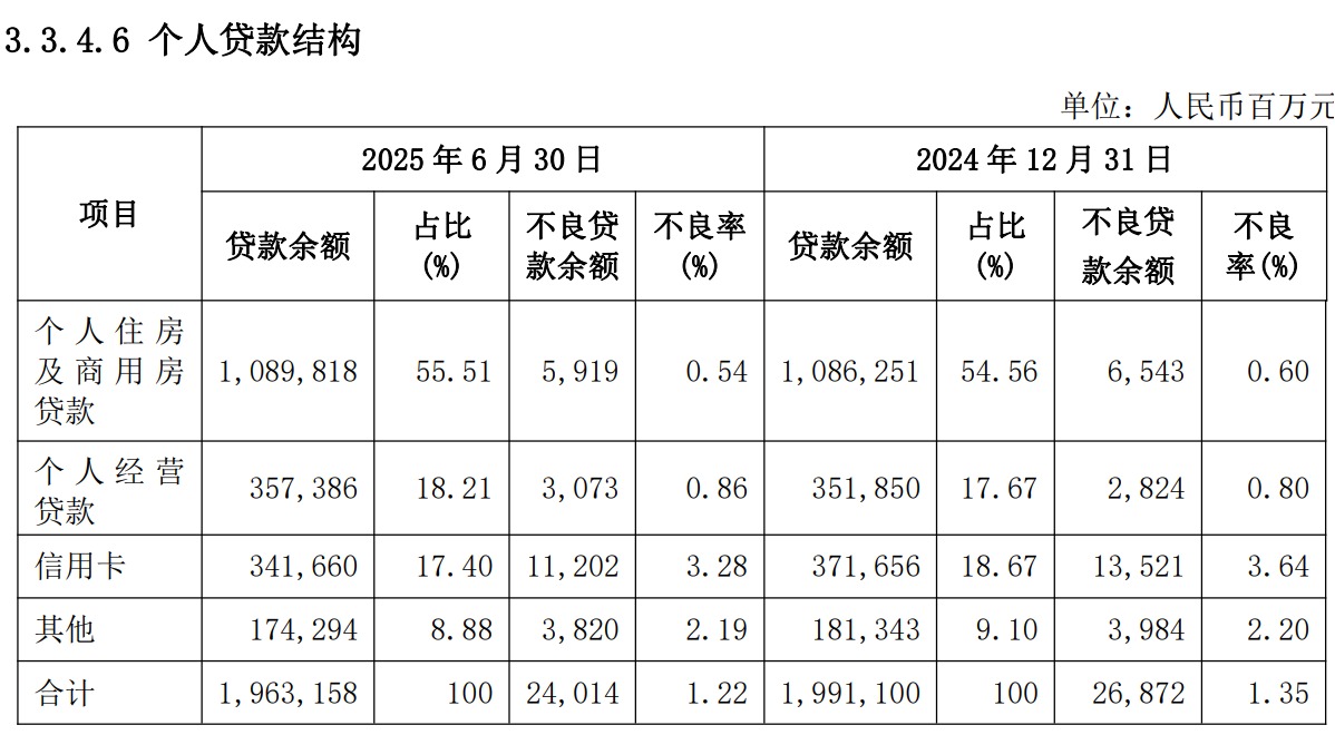 其中住房及商用房贷款余额为10,898.18亿元,个人经营贷款余额3,573.86亿元,信用卡贷款余额3,416.60亿元,其他贷款1,742.94亿元,分别占比为55.51%、18.21%、17.40%和8.88%。