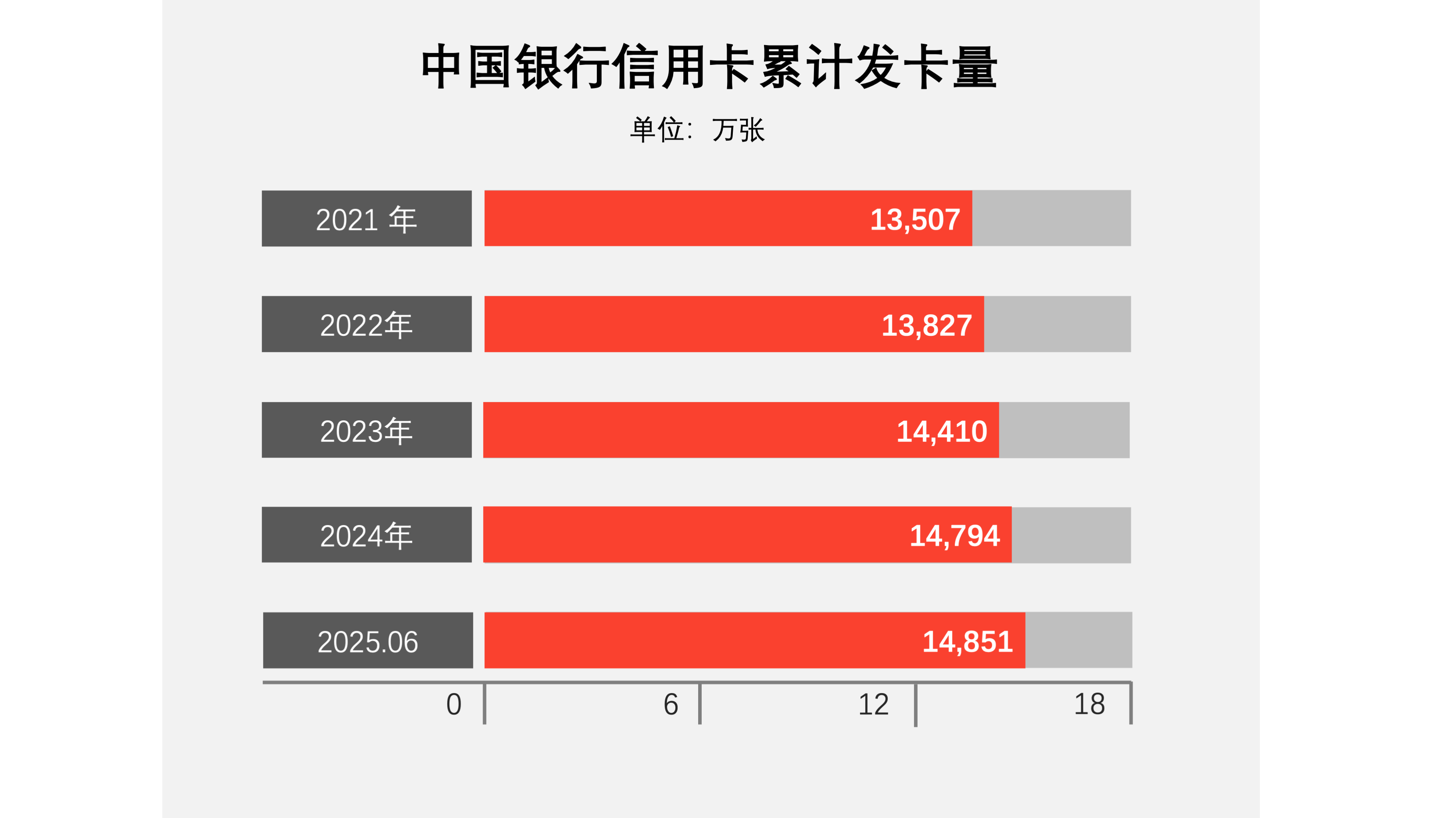 截至报告期末,中国银行信用卡累计发卡量14,851.35万张,较上年末略有增长;