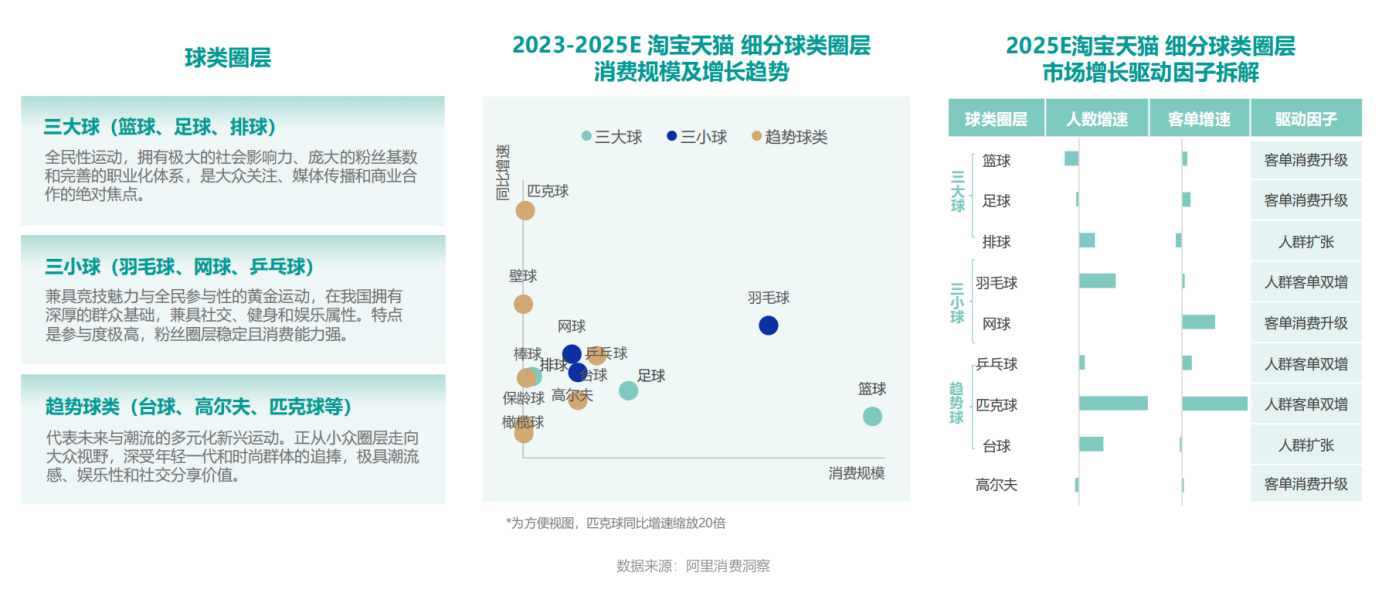 淘宝天猫数据显示,今年球类消费的市场增长主要由消费人数增加(新客涌入)和客单价提升(老客复购与消费升级)双向驱动,消费者购买黏性不断增强,球类圈层迎来精细化增长,且每个圈层都具备了不同的增长模式: