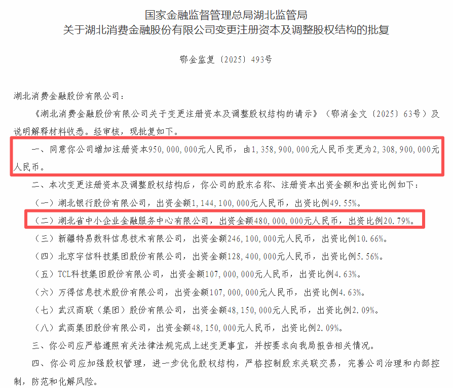 近日,国家金融监督管理总局湖北监管局发布湖北消费金融股份有限公司(下称“湖北消金”)变更注册资本及调整股权结构的批复。